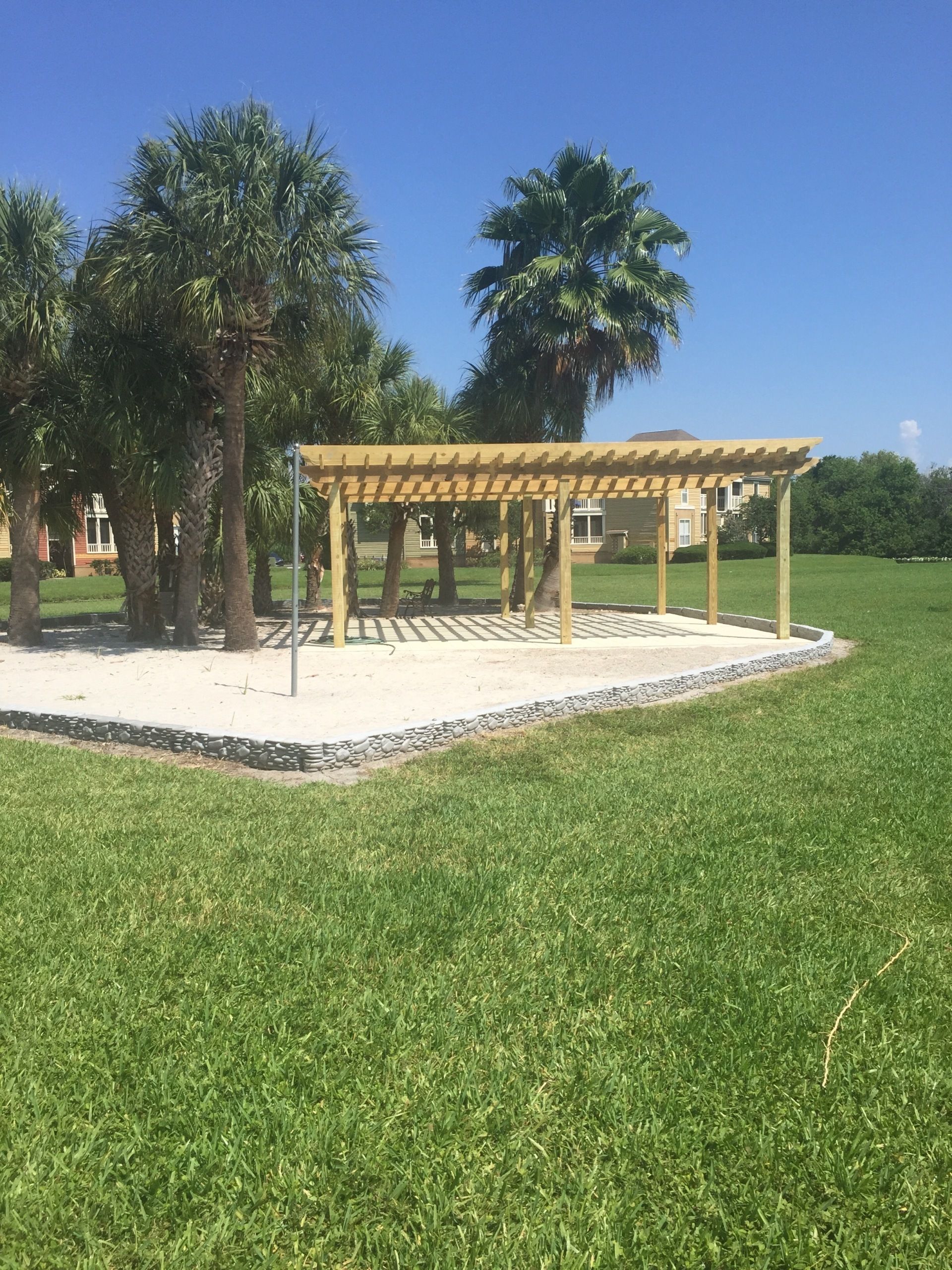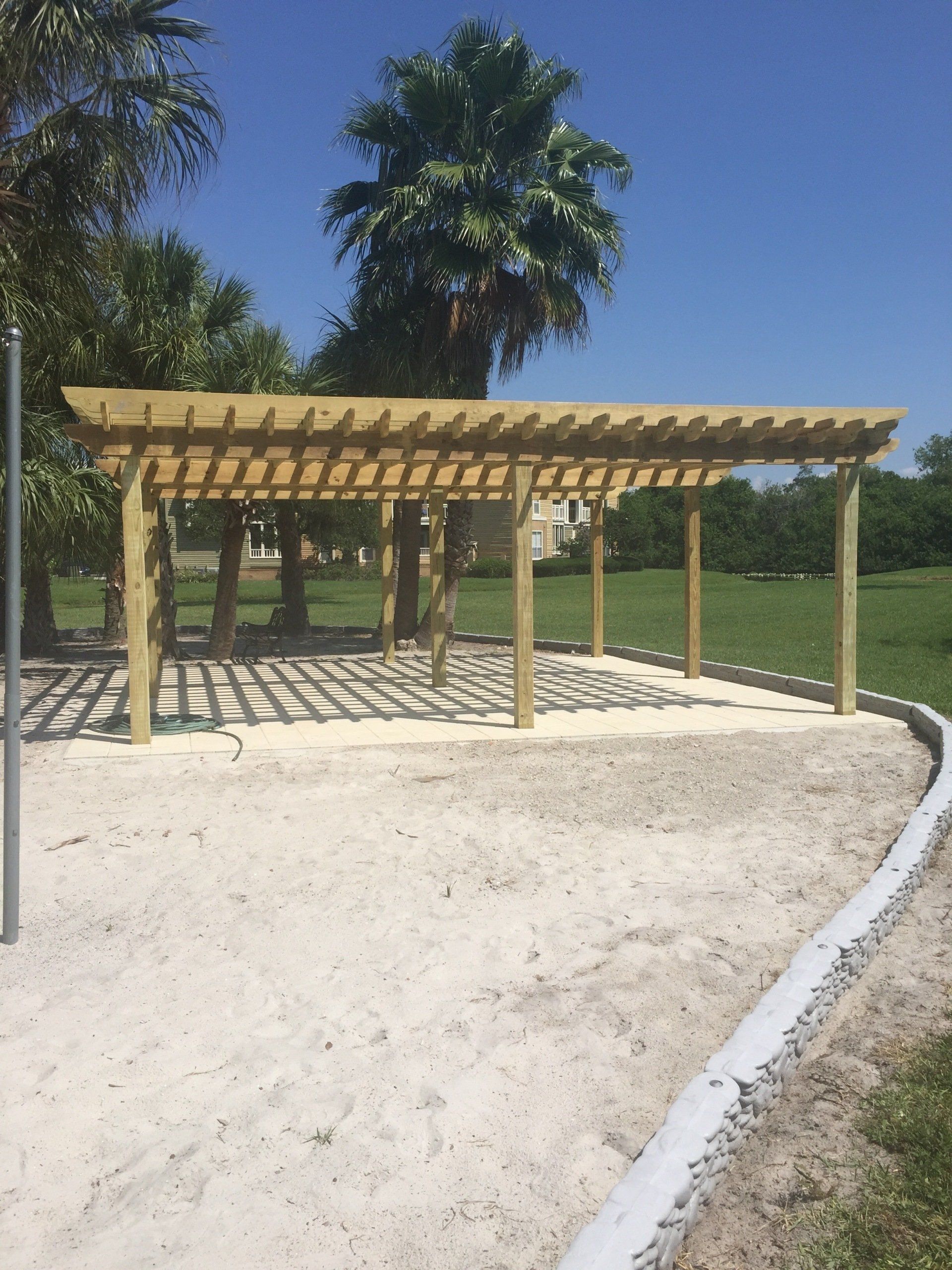 This beautiful pergola makes for a great entertainment area. The tile flooring is a nice from the surrounding sand.